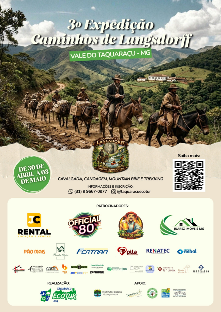 A 3ª edição da expedição “Caminhos de Langsdorff” vai percorrer o Vale do Taquaraçu, com destaque para largada em Bom Jesus do Amparo, passando por Nova União, Taquaraçu de Minas e Santa Luzia.